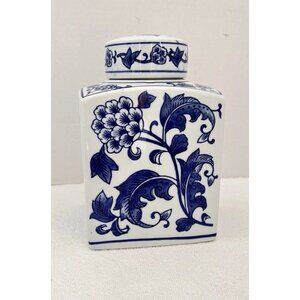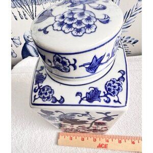 Chinoiserie Square Ginger Jar Small Blue White Floral Ceramic Lidded 4.5 x 4 x 7