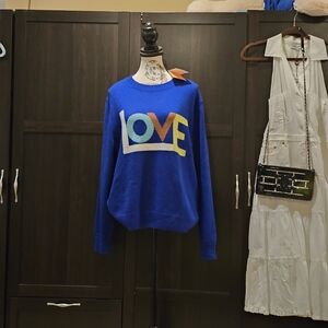 This luxe crew neck from Chinti and Parker has been spun from a wool cashmere and patterned with a charming blue and multicolor " Love " intarsia pattern.
