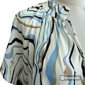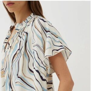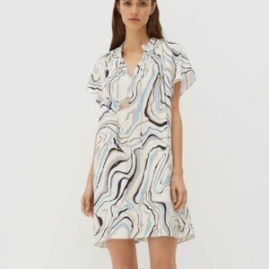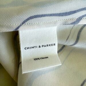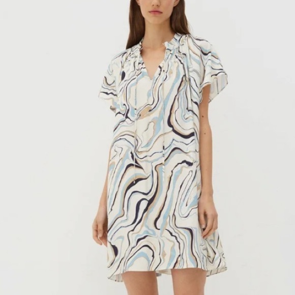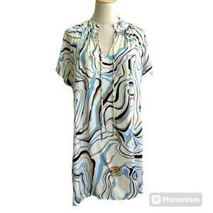 Chinti + Parker Marble Print Twill Ivory Mini Tunic Shift Dress Size 6 in excellent used condition. An easy everyday choice for summer days, this ivory twill mini dress features a hand-painted marble print with pretty swirling colors of blue, brown and black inspired by Italian craftsman Carlo Scarpa's evocative designs. With cap sleeves and a tie neck, it is has a relaxed oversized fit. Can be dressed up or down. Pullover styling. Measures approximately 23” inches underarm to underarm and from shoulder to hem approximately 33” inches! Can be worn as a tunic too depending on height. Super cute! Perfect for summer ☀️