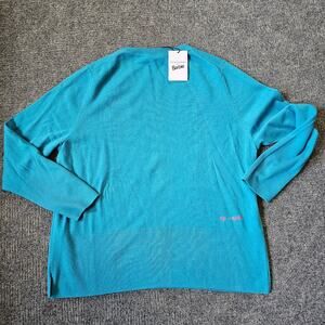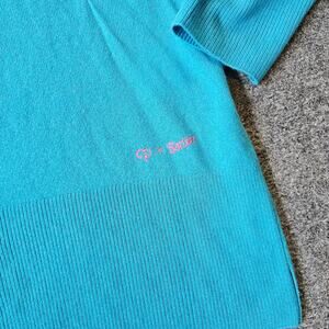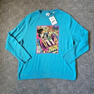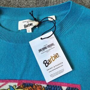 New with tags hard to find Chinti & Parker x Barbie collaborations weater. Turquoise blue wool and cashmere long sleeve sweater. Features a cartoon of Barbie and friends on a rollercoaster.