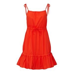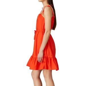 Red cotton hourglass dress. 100 % cotton. Sleeveless. Square neckline. Elastic waistband with drawstring tie at waist. Pockets. 34” from shoulder to hemline.