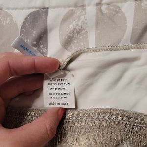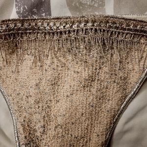 Beige with pewter fringe and silver glitter. Terry cloth and tassel add texture. I wore it once on vacation, but it is just more skin than I am comfortable with. hand washed it, but it is delicate, so there is a loose stitch. I will gladly fix it if you want. I just know some prefer to handle these things themselves. Because of the tie closures this can accommodate from xs to M. For reference I'm 5'5". 38"×26"×40" and 147lbs. The first photo is on the model in case you are tall and slender and want to know what it will look like on you.