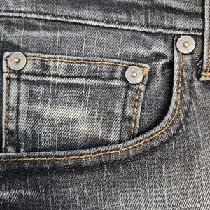 Shredded hem denim mini skirt. Distressing and whiskering. Fly front closure with button waist. Five pocket styling with embroidered detail on back pockets. The costume dept folded and sewed up the hem, but it could be let out if desired.