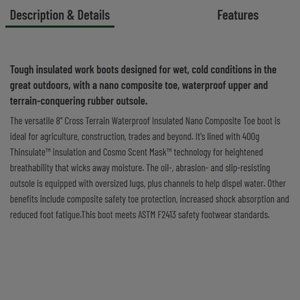 Safety features: Nano composite, EH, meets ASTM F2413 safety footwear standards.