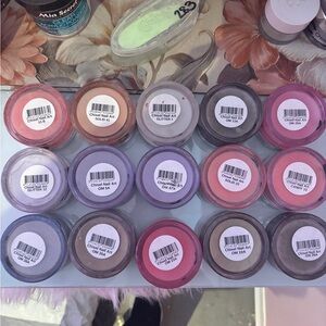 Set of 15 chisel acrylic powders, all over half full but most completely full. All colored acrylic. Will come w free gifts pictured. 2 glitter acrylic powders and a package of glitter. Great brand, great products, great consistency when applied.