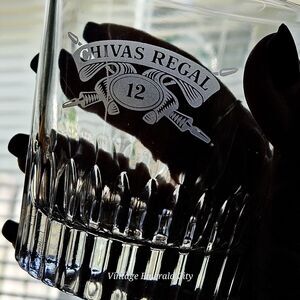 This vintage Chivas Regal Scotch whiskey drinking glass is a must-have for whiskey lovers and collectors. Made by VONPOK in Italy, this on-the-rocks glass features the etched Chivas Regal 12-year logo and a decorative bottom that adds a touch of elegance. Standing at 3.5" tall, this glass is ideal for savoring your favorite aged whiskey. Whether you use it for sipping or display, this high-quality whiskey tumbler is perfect for any barware collection.