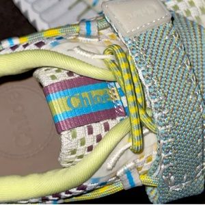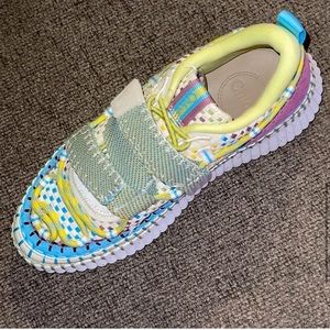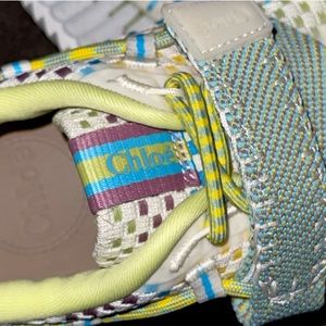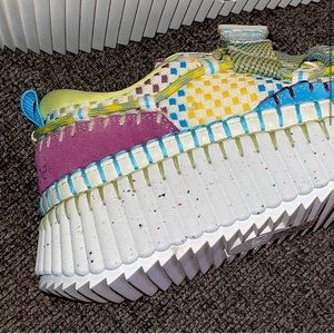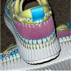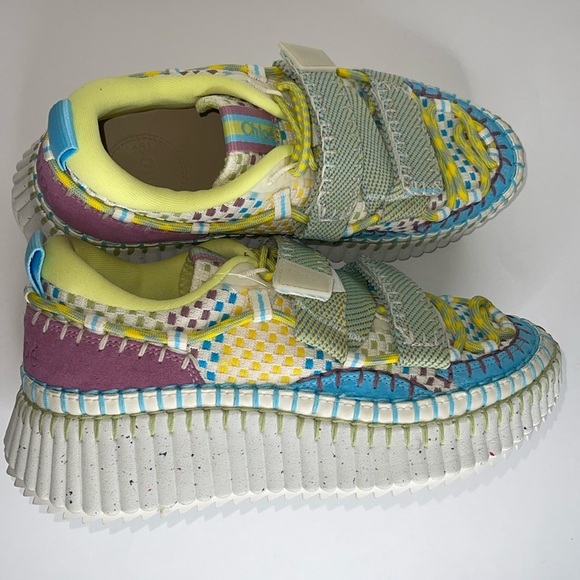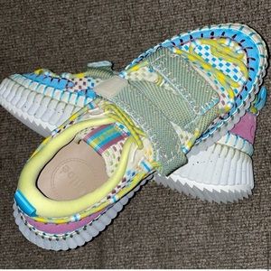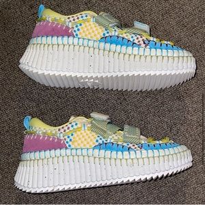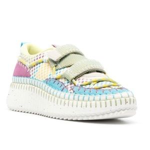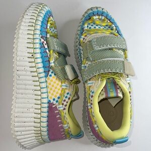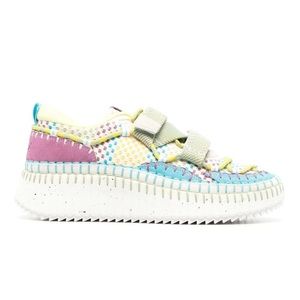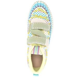 Light blue, multicolour, calfskin, calf suede, paneled design, contrast stitching, logo insole, round toe, hook-and-loop fastening at the front and flat rubber sole.