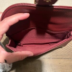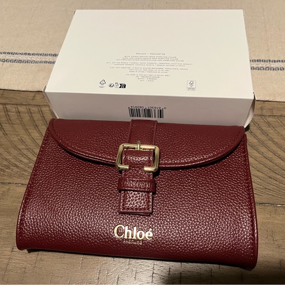 Chloe wristlet in deep burgundy leather. Features a stylish buckle and logo detail. Brand new! Beautiful for makeup or wallet use, etc.
