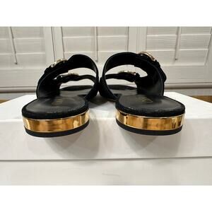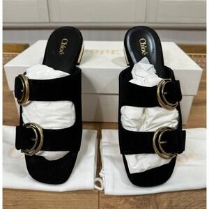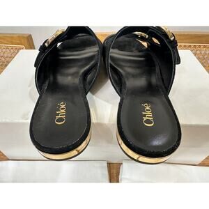 Chloé Alizè Flat Sandals Slides Black Suede Size 8 US 38 EU NIB Gold Buckles