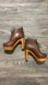 Crafted from genuine leather with a wooden platform sole (4.5” heel, 1.5” platform), they feature a multicolored knitted wool inner sock, lace-up front, serrated cap toe, and seam detailing. The rubber outsole ensures durability, while the knit ankle cover adds a unique, fashion-forward finish.