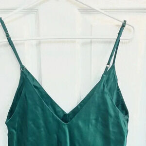 Silky satin like material in a gorgeous green. Adjustable straps, v-neck line, and lined.