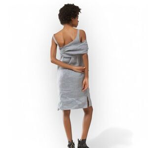 Crafted from striped linen with metallised fibres for a natural crinkled effect, this asymmetrical dress has a romantic, draped top. Wear the gathered strap on or off the shoulder. Side slits bring a feminine finish to the short silhouette.