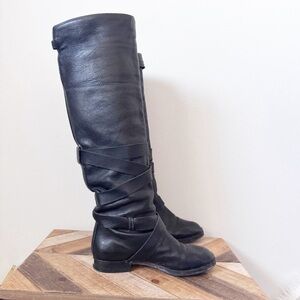In good used condition tall back riding boots Gold metal accents. Can be worn folded over.