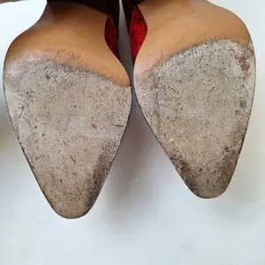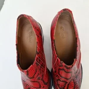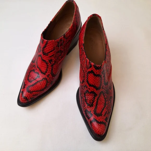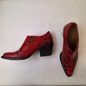 Cherry red snake/python print ankle booties. Some wear is located on the bottom toe area (shown in pictures.) Overall the leather on top is in great condition with no scratches.