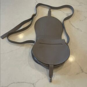 Stylish gray leather crossbody bag with gold accents. Perfect for any occasion. Dust bag included.