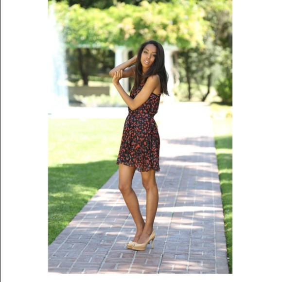 Brand new! Black silk chiffon with red floral print pleated dress. This material is so soft and flowy it makes you feel super girly and pretty in it! Sizes available: Medium