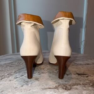 Chloé Kole white leather and beige canvas fold-down ankle boots. Bamby dots white leather and canvas 'Kole' ankle boots from Chloé featuring an almond toe, contrasting panels, a curved mouth and a mid-heel. This item can be worn folded over or not.