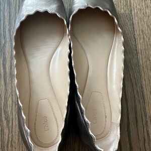 Chloe Scalloped Ballet Flats. Color is Pewter (in-between gold/silver). Great neutral color! Size 38.5 (this is European sizing, I am usually a size 8 in US). Leather is in great condition, light wear inside shoe, see pictures for wear on bottoms.
