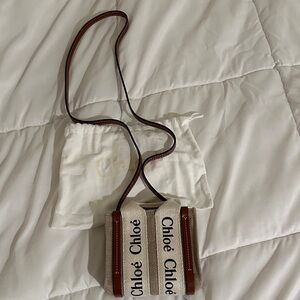 Stylish Chloe crossbody bag. Features beige fabric with brown leather accents. Elegant and versatile design.