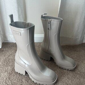 Brand new Chloe Betty rain boots in color nomad beige, size 8 (EU38). Iconic model, one of the bran's bestselling pieces. Never worn, original packaging and dust bag included.