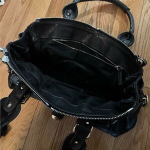 Chic black leather satchel. Features stylish chain and buckle accents. Ideal for versatile use.