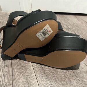 Elegant black wedges with a chic gold buckle. Perfect for elevating any outfit. Brand new never worn. This is a size 40, but I normally wear a size 8/8.5 and it fits perfectly