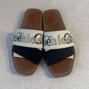 Authentic Chloe sandals with black and white straps. Features logo design. Perfect for casual wear.