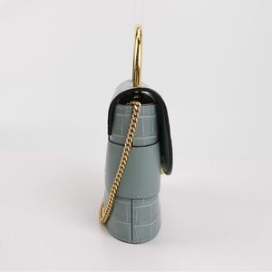 Stylish blue croc-embossed mini bag. Features elegant gold handle and chain. Perfect for any occasion.