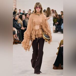 Flouncy ruffled Silhouettes in maxi and mini-dresses paired with leather and knee high boots. Free-flowing trousers and lace bodysuits paired with 70s-style denim jeans. Neutral earthy tones of tan, blush and beige with pops of mauve and dusty blue. Chunky wooded wedge heels. Utility style bags. Playful and romantic, soft and hard. Think Stevie Nicks the “Original Boho Muse” in her edgy rocker style and ultra feminine flowy dresses and scarves. Down to earth suede paired with silk, sheer, fringe and lace. Slouchy plain (no logos or details) Hobo style bags and thick leather belts or vintage chain belts slung on the hips. Cuff bracelets and oversized aviator sunglasses.