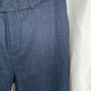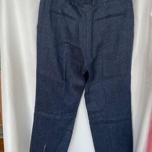 Crafted from 100% linen, featuring a cropped silhouette, piped back pockets, belt loops, side pockets, a concealed front hook and zipper closure.