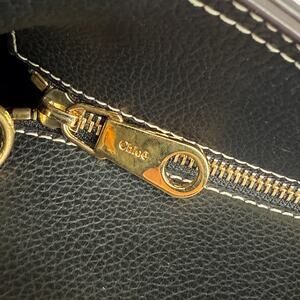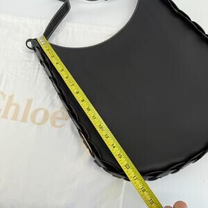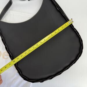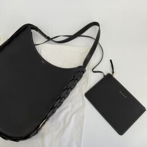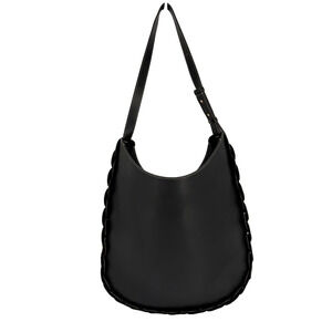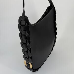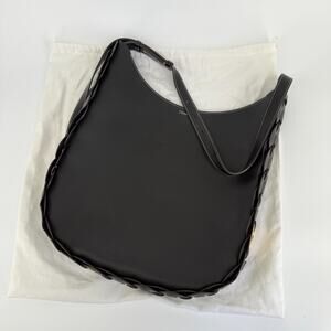 Authentic Chloé Darryl Hobo in supple black grained calfskin with signature interlaced leather ring detail. Medium size with roomy open top, adjustable shoulder strap, and detachable zip pouch. Chic contrast stitching and minimal gold-tone hardware add a refined finish. Comes with dust bag. A sleek everyday designer essential with Parisian polish—perfect for elevated minimalism, modern classic, or quiet luxury aesthetics.