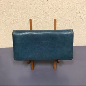 This vintage Chloe wallet in a striking teal blue hue features a luxurious leather finish and a chic bow detail on the front. Its elongated rectangular shape makes it a stylish yet practical accessory for carrying essentials. The gold-toned clasp adds a touch of elegance to this sophisticated piece.