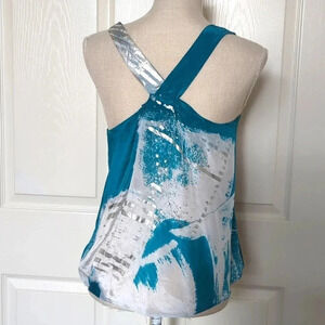 Chloe France Designer Women’s Silk Metallic Blouse Tank Aqua Fresh. Teal tone with metallic accents. Small pleated detail in front. Razor like back. 100% Silk