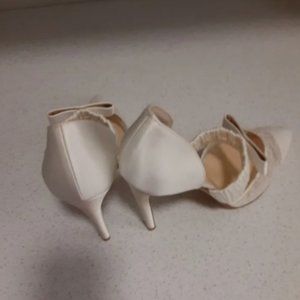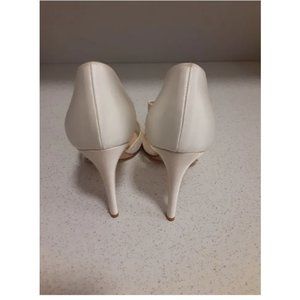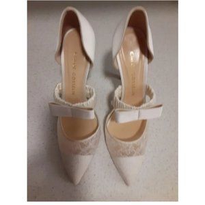 White satin and lace Lily pumps from Chloe Gosselin featuring a contrasting heel counter, lace panels, a contrasting toe box, a bow detail, an elasticated ruched strap, a branded insole and a pointed toe. These pumps are a beautiful white/champagne color. They are preowned in great condition. Slight scuffing and signs of wear on sole.