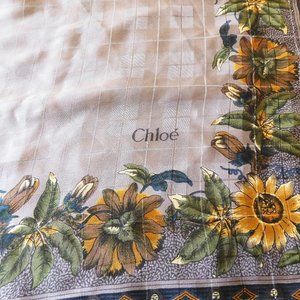 Elegant vintage Chloe scarf in EUC-GVUC slate grey with sweet sunflower border. No fabric tag, assume silk.
