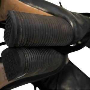 Black leather mid calf lace up boots. Round toe, platform, concealed zip closure at sides. Typically runs half size small. Heels height is 4.25”