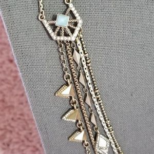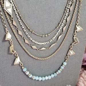 Stunning multi layer geometric boho necklace, features light aqua / sky blue beading and accents contrasting with antiqued gold. Some small rhinestone pavé accenting for the right touch of sparkle! Has some slight fading on gold chain due to wear.