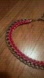 Bold necklace with gold chain and pink woven detail. Perfect for a chic look.
