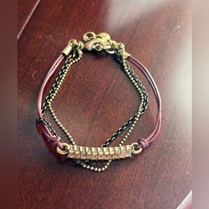 Champagne crystal, Burgundy leather, antique brass + gold-plated, lobster clasp, 1.5” removable extender. Comes in a C+I gift pouch. Hypoallergenic, nickel-free + lead safe. From my smoke-free home.