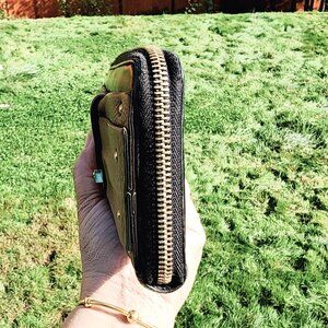 This Chloé June wallet is a must-have for any fashion-forward woman. The color block black and tan pattern, combined with the rivert button accent and bow, makes it a perfect accessory for any outfit. The wallet is made of high-quality leather and features a zip-around closure. It has plenty of space for credit cards and coins, with a coin zip pocket inside and a logo on the front. The wallet is one size fits all, measuring 4.5 inches in length and 7.5 inches in width. This wallet is perfect for anyone who wants a designer, casual, classic, feminine, fun, or preppy look. Good pre-owned condition. There are some wear you can see outside but the inside really nice no tear or stain