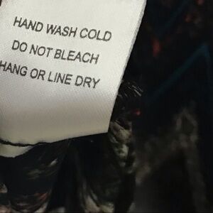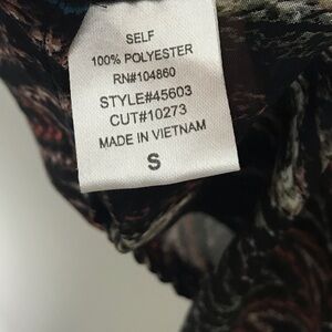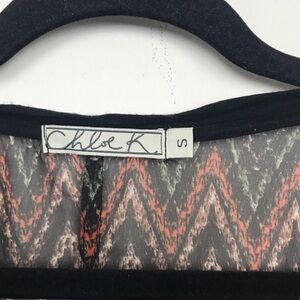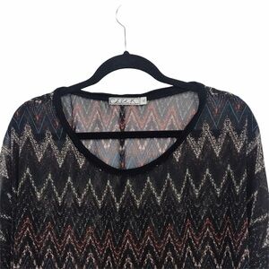 Black, boho, sheer blouse with all over zip zag geometric print. Has cropped dolman sleeves and hi low hem. Preowned but in good condition.