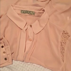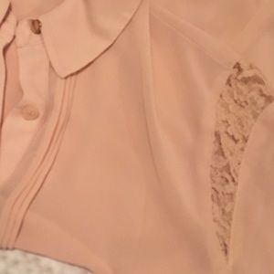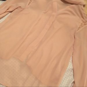 Beautiful button down with so many standout details, from the hidden buttons down the front and the lace on the shoulders to the gold buttons on the sleeves and collar. High-low style (little longer in the back). Pale pink/peach. Sheer material makes it so feminine. Can dress it up or down for multiple occasions! Barely used-in great condition!