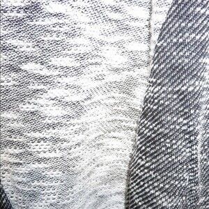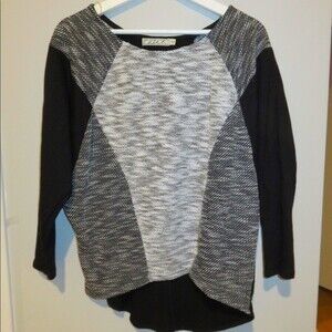 This lightweight sweater top by Chloe K is from Nordstrom. It is black on the sleeves and a color blocked pattern on the body of different shades of gray. Slightly cropped elbow length sleeves, pull over, crewneck. Slimming pattern and comfortable style. Shorter in the front than in the back. Perfect neutral! In very good condition with minimal signs of wear.