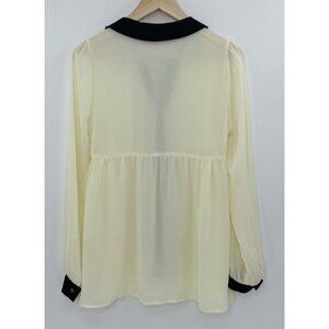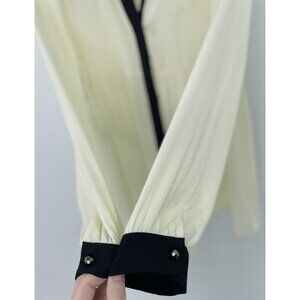 This Chloe K women's blouse in size M features a crew neck with a button closure and long sleeves with casual sleeve type. The ivory chiffon fabric is accented with black collars and buttons, giving it a preppy and gothic style. Suitable for various occasions like travel, weddings, parties, and workwear, this breathable and sheer blouse is a classic piece with a feminine touch. Made from polyester, this blouse should be hand washed to maintain its quality. Perfect for all seasons, the garment is a stylish addition to any wardrobe. Good used condition. No stains or holes found. Please feel free to ask any questions.