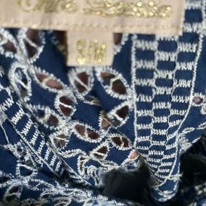 Step out in style with this elegant navy and cream eyelet jumpsuit. Perfect for any occasion, this piece combines comfort and fashion effortlessly.