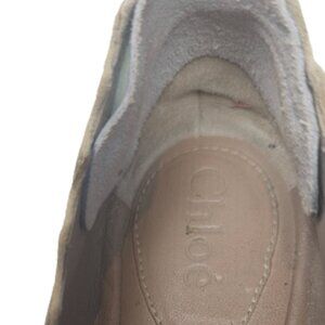 Iconic Chloe Lauren flats featuring the signature scalloped edge in a textured metallic gold leather. The tone has naturally evolved with wear, now displaying areas of silverish discoloration, giving the pair a beautifully worn-in patina. Soft leather lining and flexible soles offer both style and comfort.