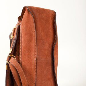 Shaped in a slouchy silhouette with feminine lines, the Marcie saddle bag from Chloe is crafted in a brown nubuck leather, and features gold-tone hardware, hand-wrapped double handles with the model's iconic buckles at the bases, a detachable shoulder strap, a front slip flap pocket secured with dangling leather tassels, and is finished with saddle stitching. The top zip opens to a roomy compartment, and contains a flat pocket with snap closures, and a zip pocket.