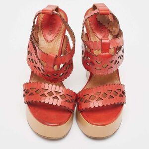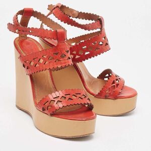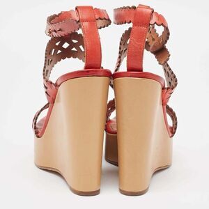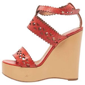 Chloe Red Laser Cut Leather Wedge Platform Ankle Strap Sandal