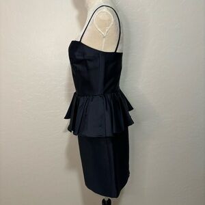 This dress is in excellent condition! 100% silk in a black midnight hue. Spaghetti straps, sweetheart neckline, peplum style. Back zip closure. Gorgeous and perfect for a wedding or any special occasion!