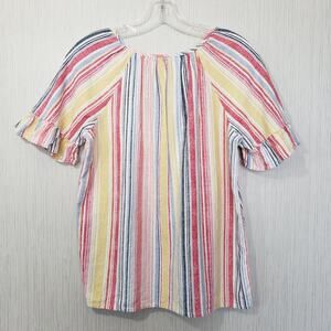 Chloe + Rene striped linen blend ruffle short sleeve tie front shirt womans sz M
